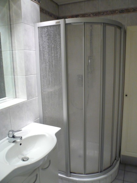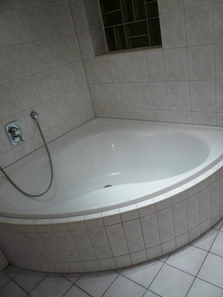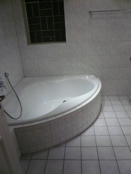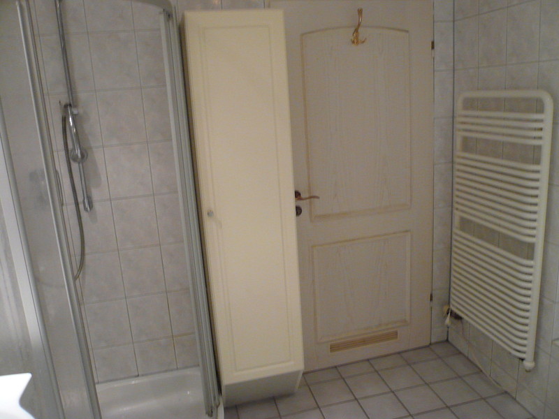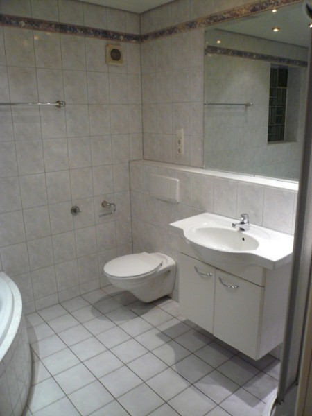 Bad sehr geräumig, mit Dusche, großer Badewanne, Handtuchheizkörper sowie Übergangsheizkörper, Fußbodenheizung und Badezimmermöbel komplett gefliest. Fußbodenheizung im Wohnbereich.Einbauküche , mit
